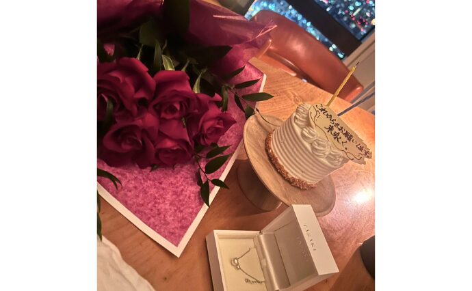 ケーキとバラの花束、婚約ネックレスをプレゼントしてもらい嬉しかったです。