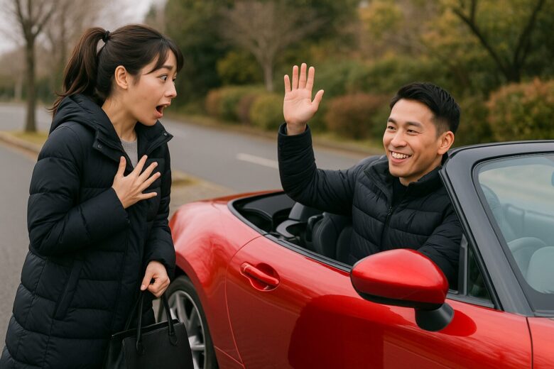・当日真っ赤なオープンカーで現れ『恥ずかしかった』
