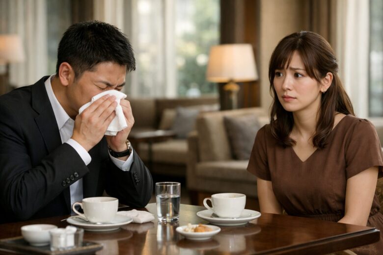 花粉症でつらいのは分かるけど、ラウンジのおしぼりで鼻をかむのは衛生面的にかなり気になる行動ですよね。お見合いは所作が印象を左右するので、ここで引っかかるのは普通です。