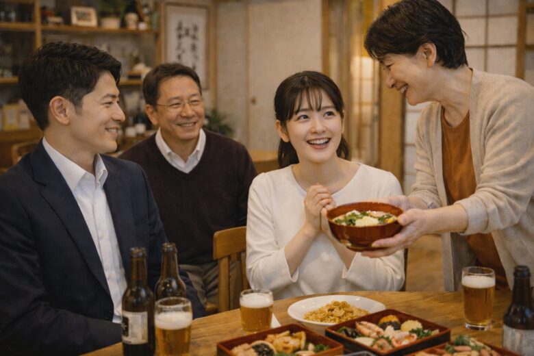 ・「いやじゃなかったら」とご両親から実家にも招待され、お雑煮やおせちを頂いた